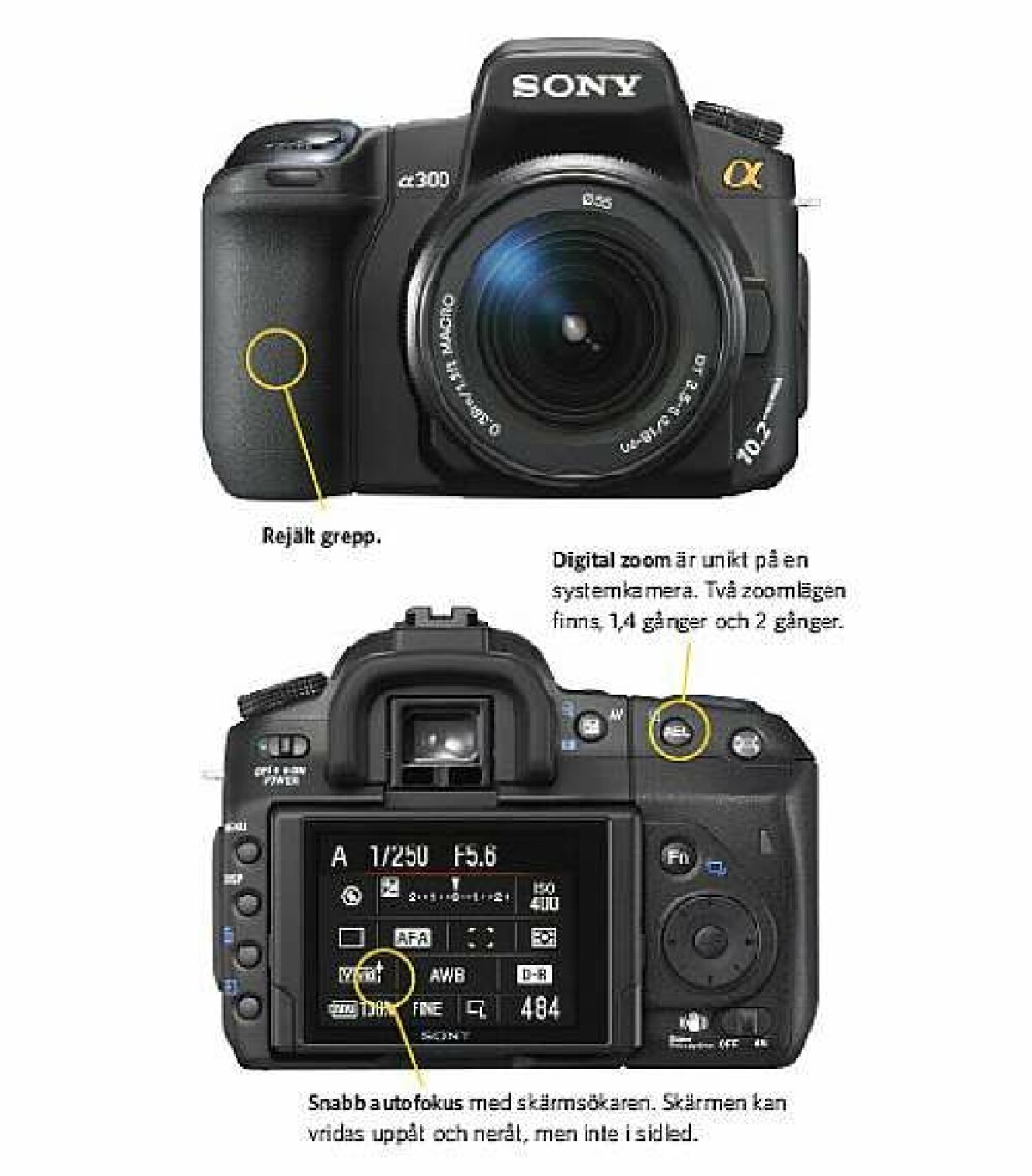 Sony har valt den senare vägen. För att vara en kamera i den billigare konsumentklassen är Sony A300 ovanligt stor och kan närmast jämföras med Pentax K200D.