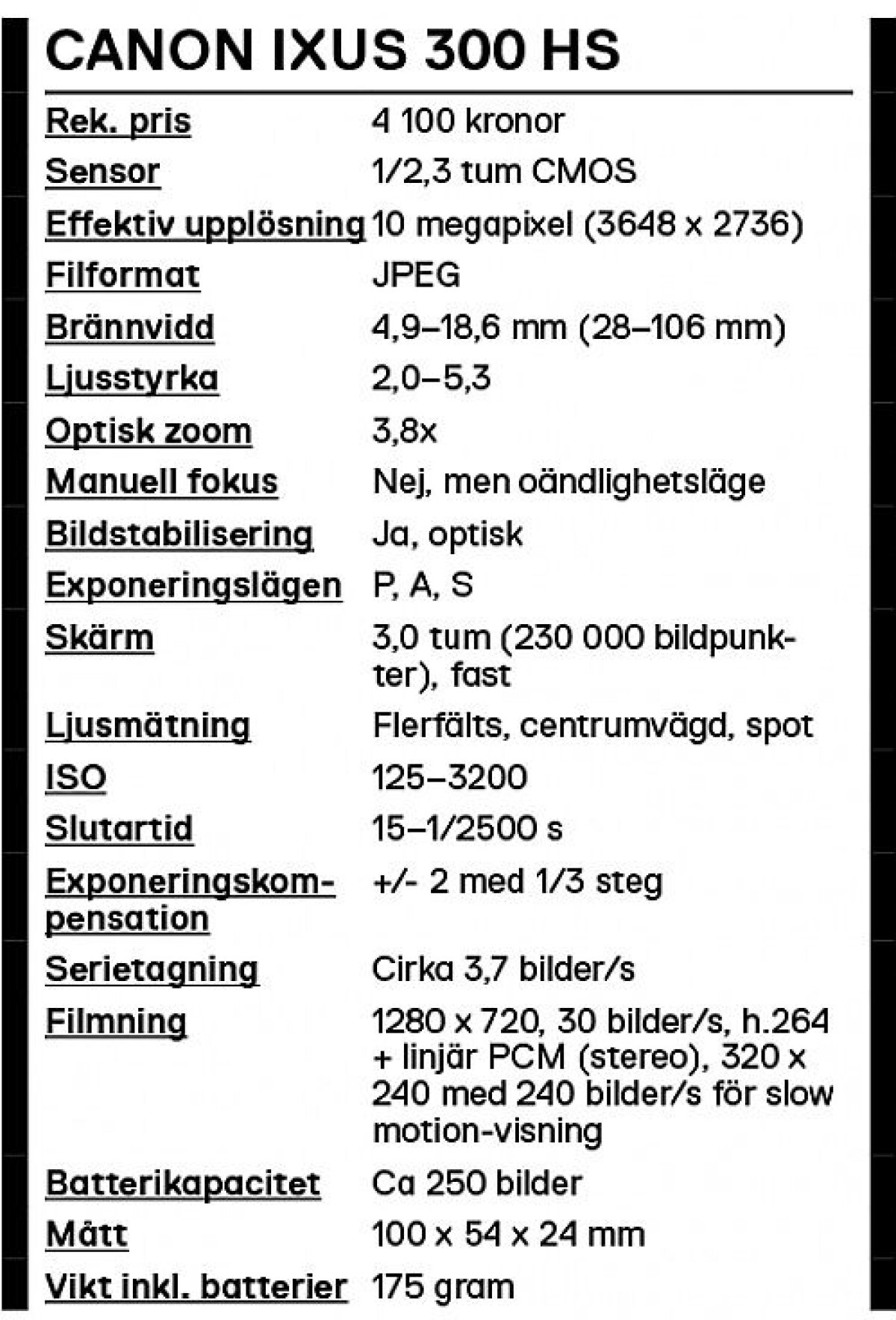 Canon Ixus 300 HS är en ovanligt bra kompakt med extremt bra mörkeregenskaper. Den är också snabb i alla lägen. Canon är medvetna om detta och tar betalt därefter. Ändå tvekar vi inte att rekommendera kameran för alla som vill ha en riktigt bra kompakt.