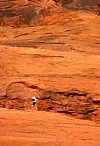 Löpning i Moaböknen, Utah i USA. Fotograferat med långt tele. Löparen Fredrik Ölmqvist har Peder placerat i nedre delen av bilden, i det mörkare fältet av berget. Den vita klädseln blir en kontrast till bakgrunden. Peder har även skalat av färgtoner och reducerat färgomfånget i bilden. Foto: Peder Sundström