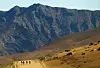 Foto från Namibia. Här har Peder använt kraftigt tele för att krympa ihop det hotfulla berget mot cyklisterna. Kontexten var att cyklisterna gick ut på en två dygns cykling i en av världens största vildmarker. Den känslan ville Peder få fram i reportaget.