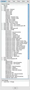 Till vänster i programvyn finns listan över Presets indelad i olika kategorier. Klassiska filmer som Kodak Tri-X finns i listan. För muspekaren över en preset för att få en kort förklaring vad det gör med bilden. Ibland ges också en liten historisk beskrivning av vad filmen en gång i tiden användes för. Under Vintage finns presets som efterliknar riktigt gamla fotografiska processer, även om filmer i sig är gamla så är de här ännu äldre. Här finns Calotype från 1840-talet och Daguerrotype som introducerades 1839 och var en av de första storskaliga fotografiska teknikerna. Du får Daguerrotype komplett med korn, damm och vinjettering.