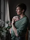 Till exempel har Johan fotograferat Göran som har sin dotter Liv inlindad i en sjal, som ett knyte på sin mage. Ett stillsamt sidoljus faller in från fönstret som Göran blickar ut genom.