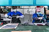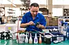 Tillsammans går vi genom en väg mellan två hus, för att vika in i en verkstad med höga hyllor fyllda med massor av lådor, prylar, verktyg och råmaterial. Det är här som många delar av råmaterialet får sin rätta form för att passa in som en del av flera hundra, i konstruktionen som i slutändan ska bilda ett stativ. Förutom den höga ljudvolymen av pressar, slagmaskiner, klingande och stål som landar på stål, är värmen det andra man vill fly från. Lite längre in i lokalen finns några fläktar, och det är också där som de som arbetar håller till.