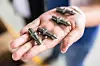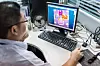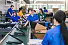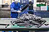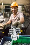Precis samtidigt plockar han ut nya, färdiga och brännheta delar ur maskinen. Något som ser ut som rymdskeppet Voyager från Star-Trek kommer ut, och det är de små delarna som sitter samman med de stora – och ska separeras från varandra. Det är mycket pill och spill, men också ett jobb som måste göras manuellt. Sedan skickas låda efter låda uppåt i fabriken till nästa anhalt i den enorma fabriken.