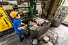 Bara någon meter från väggen står det stora maskiner med enorma hydrauliska länkarmar och varningsskyltar. Värmen har övergått till oförstånd, och anledningen är de nästan 700 graderna som krävs i smältan för att smälta aluminiumtackorna till rinnande aluminium. Mannen lägger sakta i några tackor i den orangefärgade hettan och plockar upp en stor slev för att håva upp smält metall in i formpressen som ska skapa nya stativdelar.