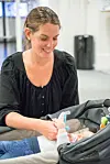 Lina gillar den avslappnade stämningen under kursen. Hon tycker det fungerar bra att ta hand om dottern och samtidigt lyssna på Anna.