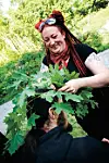När Linda och Andreas kolla klart på bilderna är det dags att förbereda nästa fotografering. Linda har plockat några ekgrenar och gör en krona. Hon ska göra om Andreas till Bergakung.