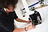 När vi börjar prata kamerateknik vill Helene visa sin favorit. Vi går bort till ett skåp där hennes olika kamerautrustningar ligger välsorterade i olika plastbackar. Här finns en Canon 5d med olika objektiv och en blixt, en analog Pentax mellanformatskamera, hennes Mamiya med digitalbakstycket. Men även pärlan, en handbyggd Ebony storformatskamera som hon beställt från Japan.