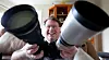 Mats plockar fram sitt privata Canon EF 300/2,8 av den äldre modellen. Det har ett motljusskydd av aluminium. Nikonobjektivet har motljusskydd av kolfiber. Jag väger dem i var sin hand och det märks att kolfiber sparar lite vikt.