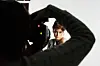 En stylist springer fram och rättar till något. Sara bränner av några fler bilder. Carlo Bosco, med många års erfarenhet av modefotografering spelar med. Svankar med ryggen i någon slags fågelpose. Modellen gör detsamma.