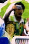 Skärpan ligger på de tampande cyklisterna men i publiken framträder en jublande person tydligt.