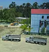 Vid en första anblick skulle inte många tro att det var riktiga lastbilar på bilden. Himlen och lastbilarna har här målats med en pensel i färgläge för att förstärka leksakskänslan.