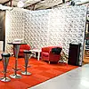 Det är vår formgivare Henrik Apell som fått intreda montern. I sitt illustrationsprogram har han gjort en tredimensionell skiss över hur montern ska inredas. Han har letat upp lämpliga tyger så Ikea och bestämt färg på väggar och golv. Snyggt och mysigt kommer det att bli.